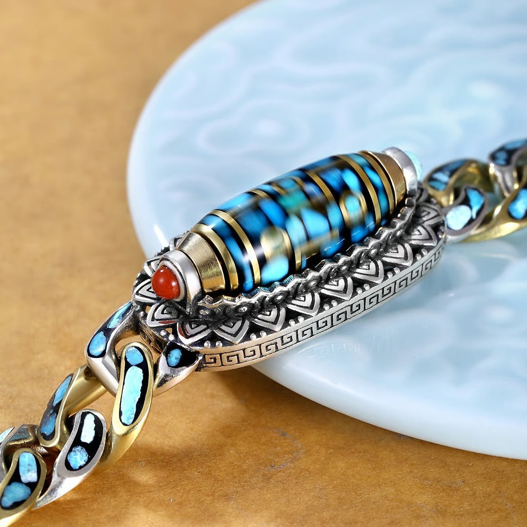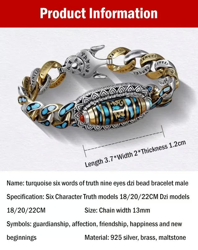 Turquoise Six-character Mantra Nine-eyed Dzi Bead Bracelet